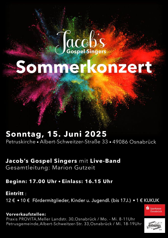 Die „Jacob’s Gospel Singers“ kommen aus der Evangelisch-lutherischen Apostel-Gesamtkirchengemeinde Osnabrück und wirken von dort in den ganzen Kirchenkreis Osnabrück und darüber hinaus. Jedes Jahr begeistern die „Jacob’s“ mit Konzerten und sozialem, diakonischem Engagement in verschiedenen Einrichtungen. Im Anschluss an das Konzert haben die Besucher die Gelegenheit, den Abend mit gekühlten Getränken ausklingen zu lassen.