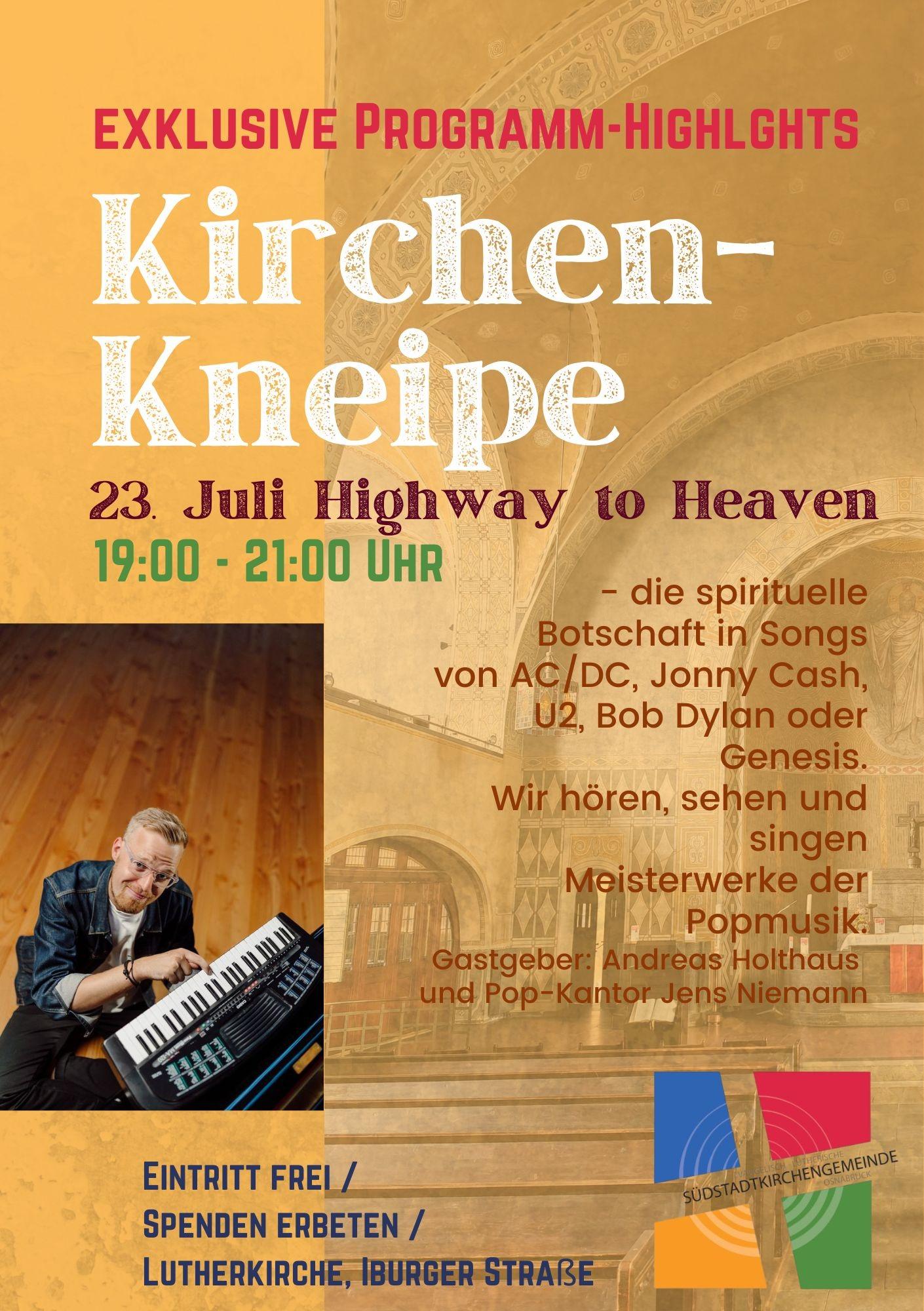 Unter der Überschrift „Highway to Heaven“ lädt die Evangelisch-lutherische Südstadtkirchengemeinde am Mittwoch, 23. Juli, von 19 bis 21 Uhr zur Kirchenkneipe in die Lutherkirche, Miquelstraße 5, 49082 Osnabrück, ein.