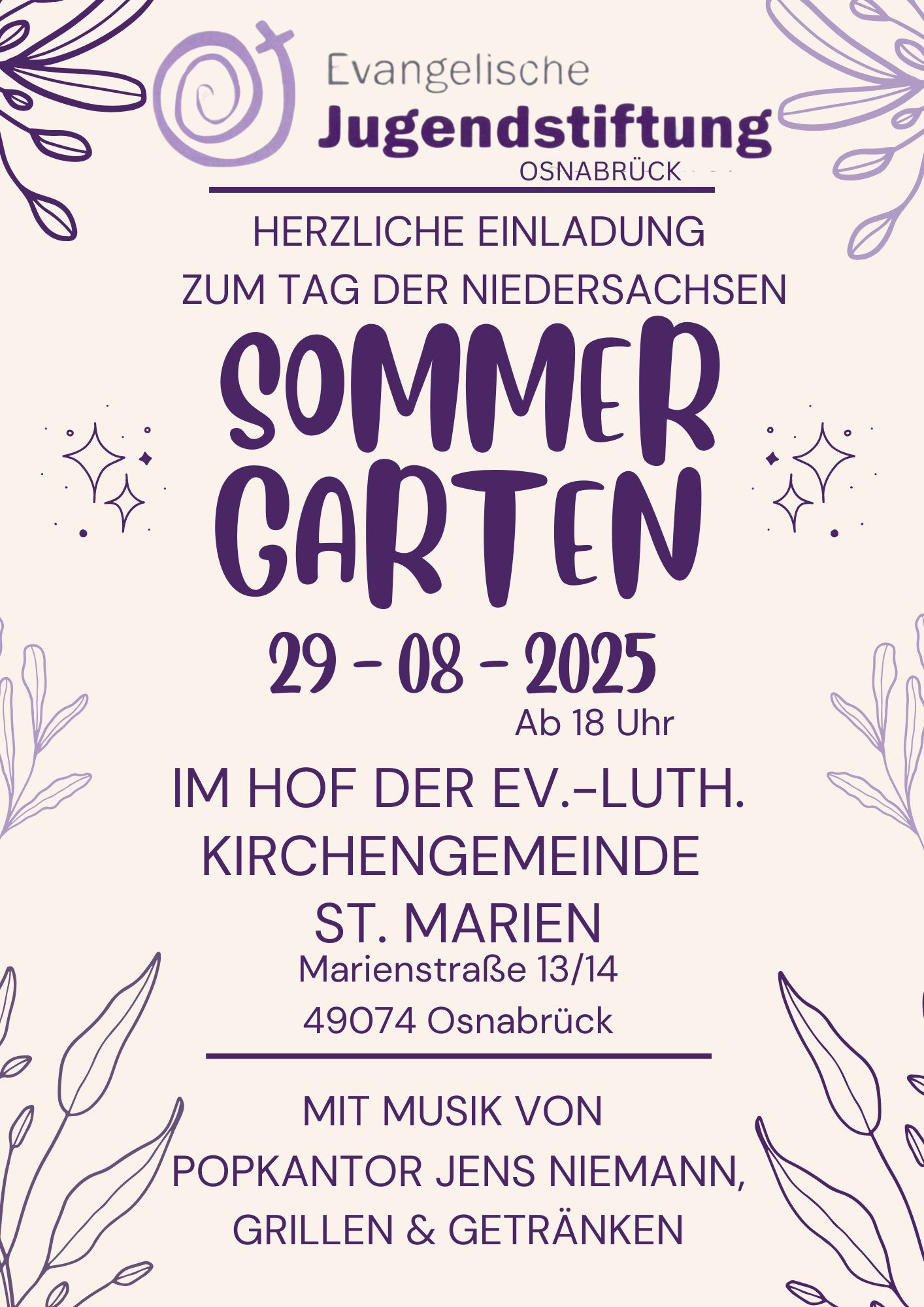 Beim Tag der Niedersachen lädt die Evangelische Jugendstiftung Osnabrück zum Sommergarten ein. Die Veranstaltung findet am Freitag, 29. August, ab 18 Uhr im Innenhof der Evangelisch-lutherischen Kirchengemeinde St. Marien, Marienstraße 13/14, 49074 Osnabrück, statt.