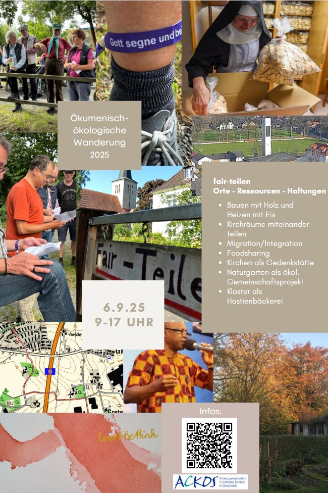Etwas Proviant einpacken, Wanderschuhe schnüren und los geht’s: Am Samstag, 6. September, lädt die Arbeitsgememeinschaft Christlicher Kirchen in Osnabrück (ACKOS) herzlich ein zur diesjährigen ökumenisch-ökologischen Wanderung anlässlich des „Tags der Schöpfung“.