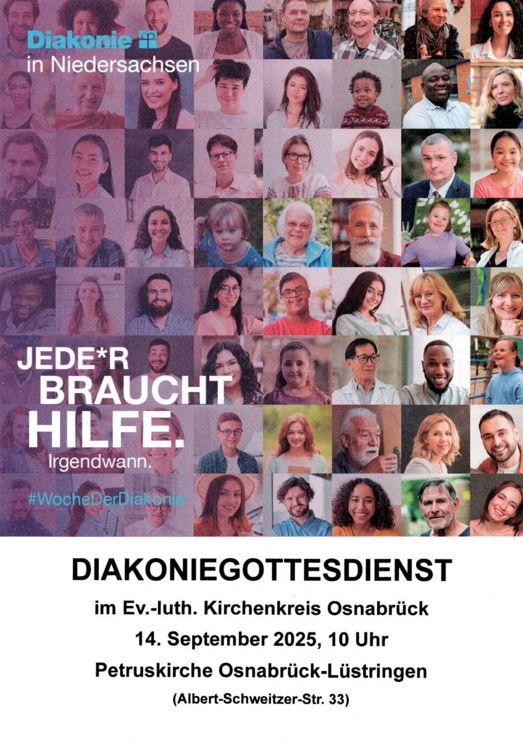„Jede*r braucht Hilfe. Irgendwann.“ – so lautet in diesem Jahr das Motto zur Woche der Diakonie. Im Evangelisch-lutherischen Kirchenkreis Osnabrück findet zu diesem Thema am Sonntag, 14. September, ein Gottesdienst in der Petruskirche, Albert-Schweitzer-Straße 33, 49086 Osnabrück, statt.