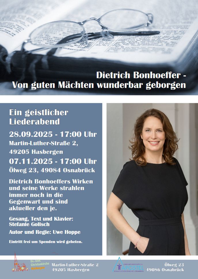 Unter der Überschrift „Dietrich Bonhoeffer – Von guten Mächten wunderbar geborgen“ lädt die Evangelisch-lutherische Christuskirchengemeinde Hasbergen am Sonntag, 28. September, um 17 Uhr zu einem geistlichen Liederabend in die Christuskirche, Martin-Luther-Straße 2, 49205 Hasbergen, ein.