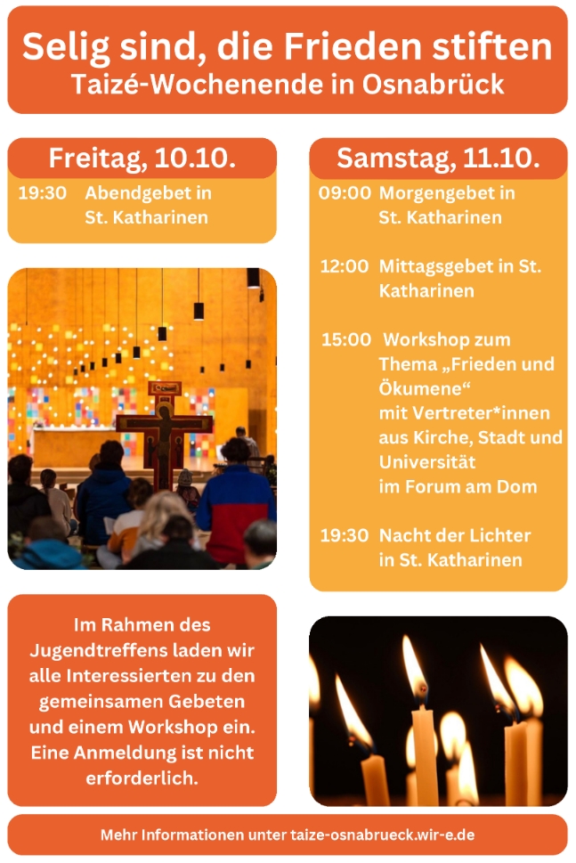 Zum Taizé-Jugendtreffen, das von Freitag, 10. Oktober, bis Sonntag, 12. Oktober, in Osnabrück stattfindet, erwartet das Organisationsteam rund 150 Teilnehmende. Der Großteil kommt aus Deutschland, aber auch aus den Niederlanden, Belgien, Frankreich, Italien, Österreich, der Schweiz, Polen, England und Norwegen werden Gäste anreisen.