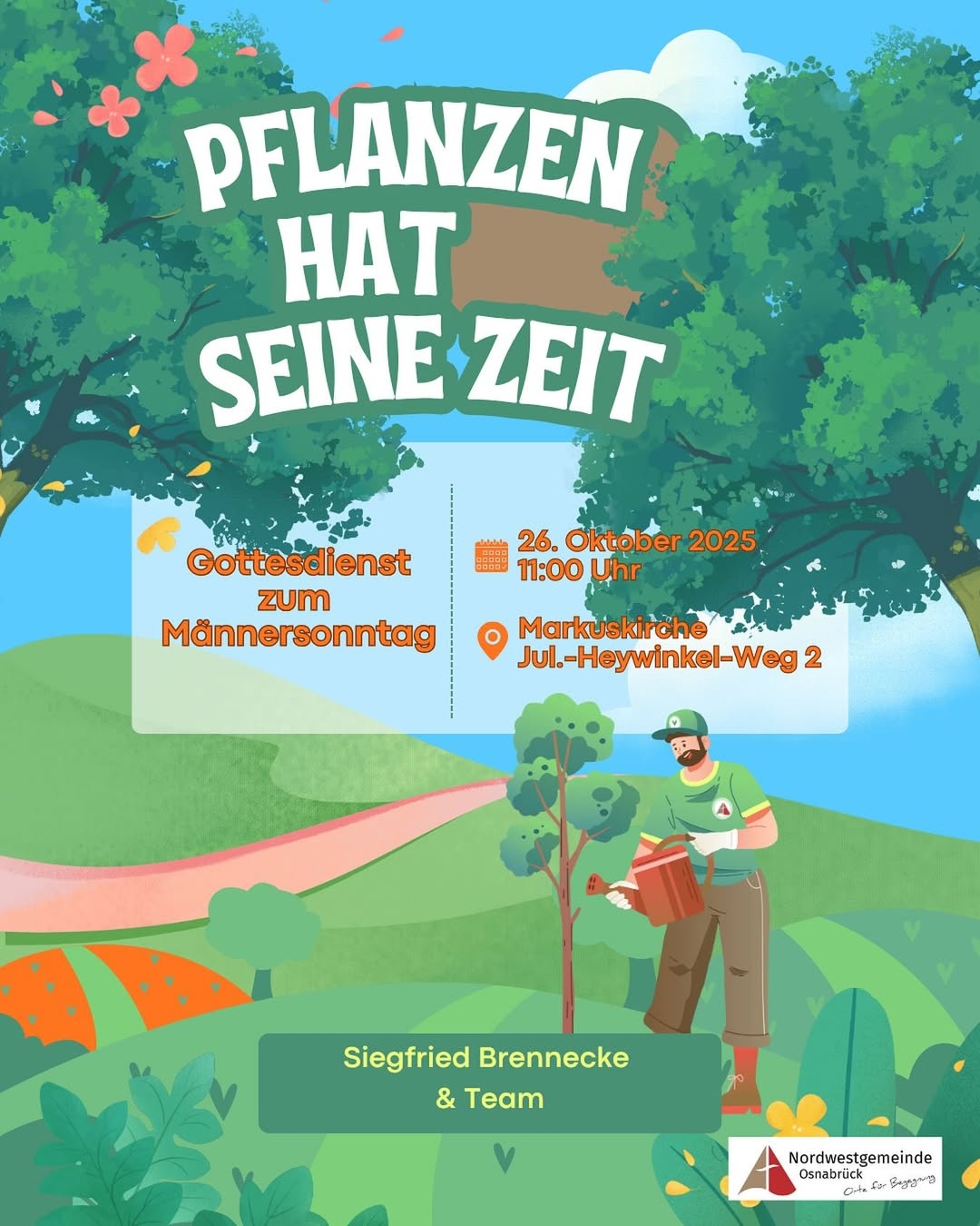 Unter der Überschrift „Pflanzen hat seine Zeit“ (Prediger 3,2) lädt die Evangelisch-lutherische Nordwestgemeinde am Sonntag, 26. Oktober, um 11 Uhr zu einem Gottesdienst zum Männersonntag in der Markuskirche, Julius-Heywinkel-Weg 2, 49076 Osnabrück, ein.