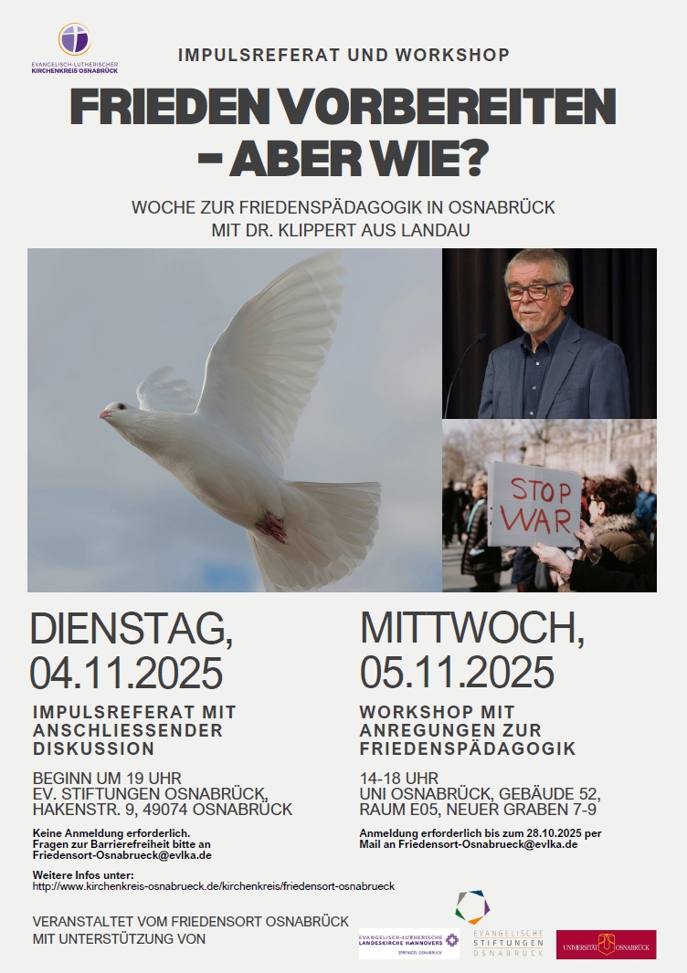 Der Friedensort Osnabrück FO:OS im Evangelisch-lutherischen Kirchenkreis Osnabrück lädt ein zu einem Impulsreferat mit anschließender Diskussion am Dienstag, 4. November, um 19 Uhr. Veranstaltungsort ist das Gebäude der Evangelischen Stiftungen Osnabrück, Hakenstraße 9, 49074 Osnabrück. Unter der Überschrift „Frieden vorbereiten – aber wie? Plädoyer für einen reflektierten Pazifismus“ ist Dr. Heinz Klippert aus Landau/Rheinland-Pfalz als Gastredner eingeladen. Moderiert wird der Abend von Pastor Cord-Michael Thamm, Friedensbeauftragter des Kirchenkreises Osnabrück.