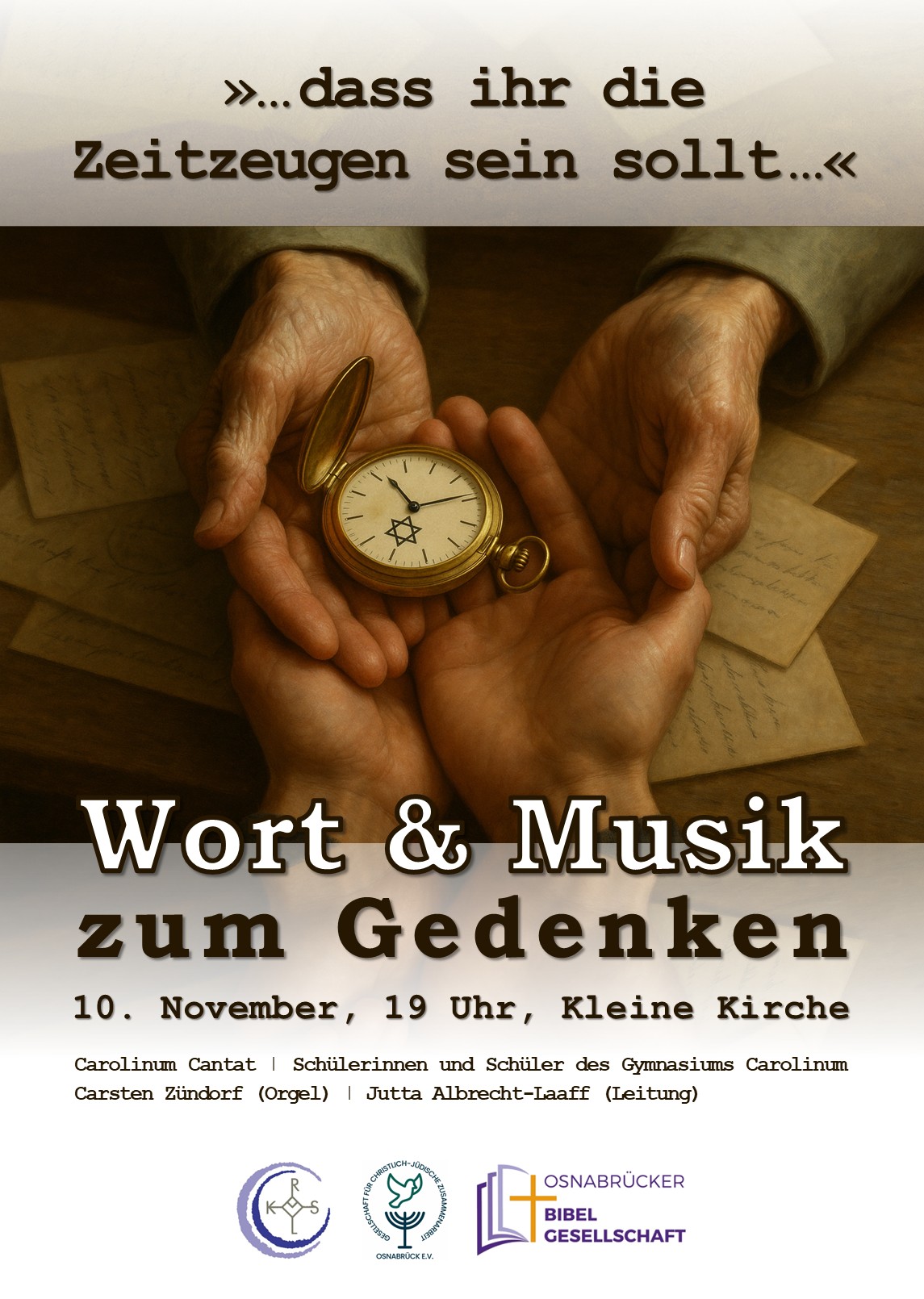 Zum Jahrestag der Novemberpogrome von 1938 gestalten der Chor Carolinum Cantat unter Leitung von Jutta Albrecht-Laaff, Kirchenmusikdirektor Carsten Zündorf an der Orgel sowie Schüler*innen des Gymnasiums Carolinum und Pastorin Dr. Laura Schimmelpfennig (Osnabrücker Bibelgesellschaft) eine Gedenkstunde. Die Veranstaltung findet am Montag, 10. November, statt und beginnt um 19 Uhr in der Kleinen Kirche, Große Domsfreiheit 6, 49074 Osnabrück. Sie steht unter dem auffordernden Zitat der in diesem Jahr verstorbenen Zeitzeugin Margot Friedländer: „… dass ihr die Zeitzeugen sein sollt, die wir nicht mehr lange sein können.“