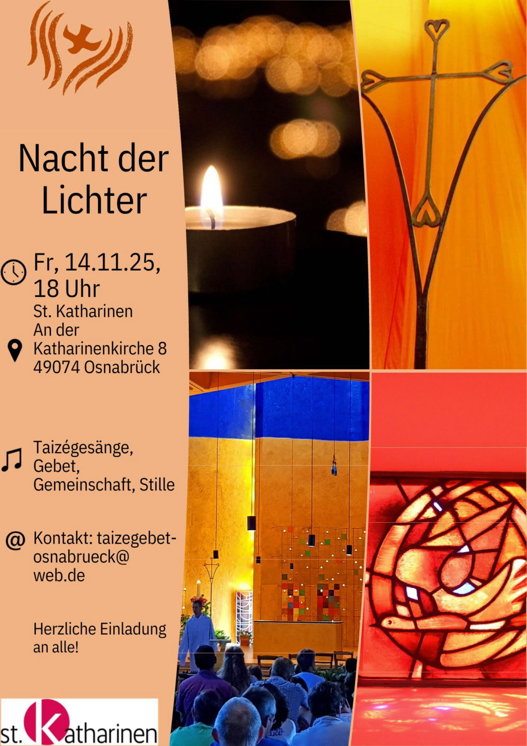 Eine ökumenische Nacht der Lichter findet am Freitag, 14. November, um 18 Uhr in der Evangelisch-lutherischen Kirche St. Katharinen, An der Katharinenkirche, 49074 Osnabrück, statt. Eine Gruppe Ehrenamtlicher, die sich für Taizé begeistert, bereitet dieses längere Taizégebet vor. Es gibt einen Lichtritus, Gebet am Kreuz, Raum für Gemeinschaft, Stille und viel Gesang. Ein Gedanke des Abends ist, dass möglichst viele unterschiedliche Menschen im Geist der Ökumene zusammenkommen. Zudem ist die Nacht der Lichter eine Vorbereitung auf das von Taizé organisierte europäische Jugendtreffen, das vom 28. Dezember bis 1. Januar in Paris stattfindet.