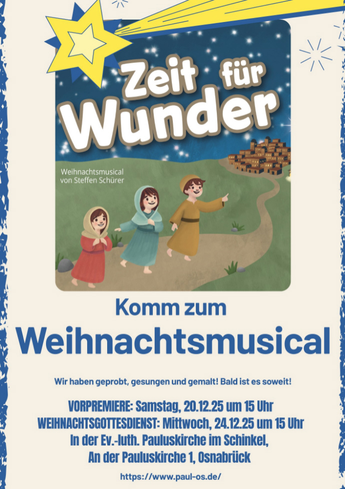 In der Evangelisch-lutherischen Paulusgemeinde in Osnabrück laufen die Proben für das Weihnachtsmusical „Zeit für Wunder“ von Steffen Schürer. An Heiligabend, Mittwoch, 24. Dezember, findet um 15 Uhr der Gottesdienst mit dem Musical in der Pauluskirche, An der Pauluskirche 1, 49084 Osnabrück, statt. Eine Vorpremiere gibt es am Samstag, 20. Dezember, um 15 Uhr im Gemeindehaus, Wesereschstraße 76, 49084 Osnabrück.