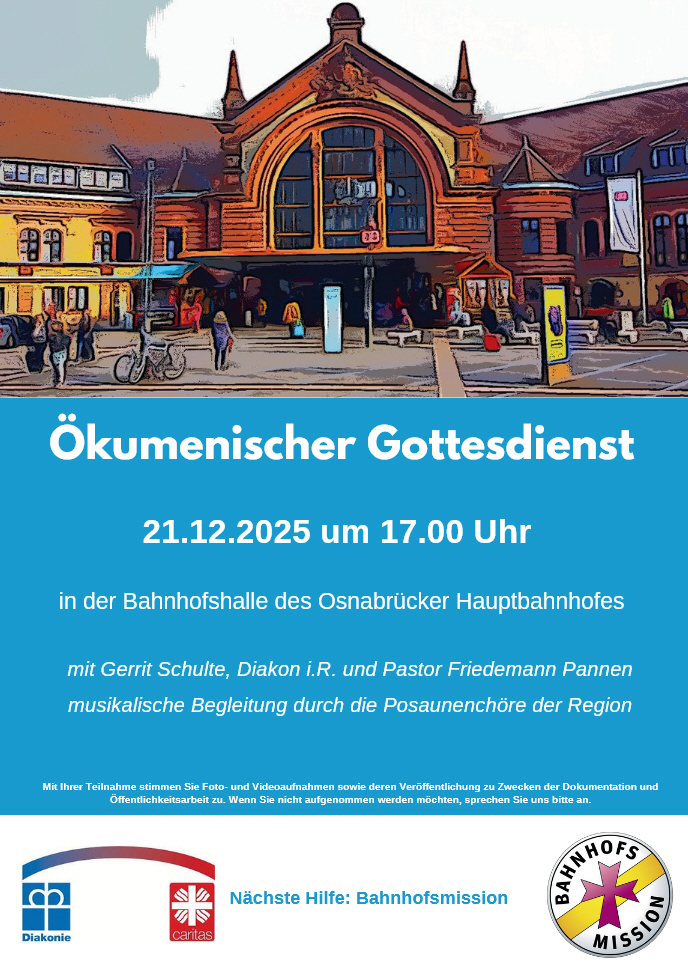 Der Ökumenische Gottesdienst am Osnabrücker Hauptbahnhof findet am Sonntag, 21. Dezember, um 17 Uhr in der Bahnhofshalle statt. Circa 90 Musiker*innen verschiedener Posaunenchöre aus Stadt und Region Osnabrück übernehmen unter der Leitung von Volker Wallrabenstein die musikalische Begleitung und sorgen für Adventsstimmung. Den Gottesdienst halten Pastor Friedemann Pannen und Diakon i.R. Gerrit Schulte. Die Kollekte ist für die ökumenisch arbeitende Bahnhofsmission Osnabrück bestimmt.