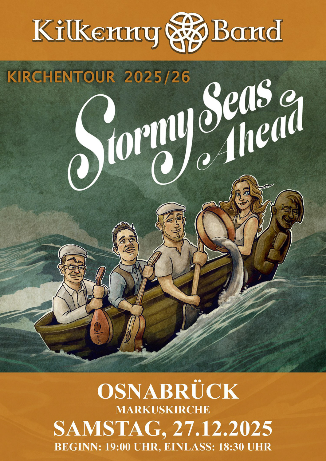 Die bekannte Irish-Folk-Band spielt im Rahmen ihrer Kirchentour 2025/2026 unter dem Titel „Stormy Seas Ahead“ Lieder über die Seefahrt sowie Heim- und Fernweh. Im Mittelpunkt des Konzerts stehen getragene Balladen, die in der Akustik der Kirche besonders gut zur Geltung kommen.