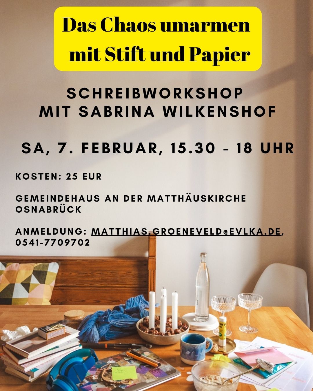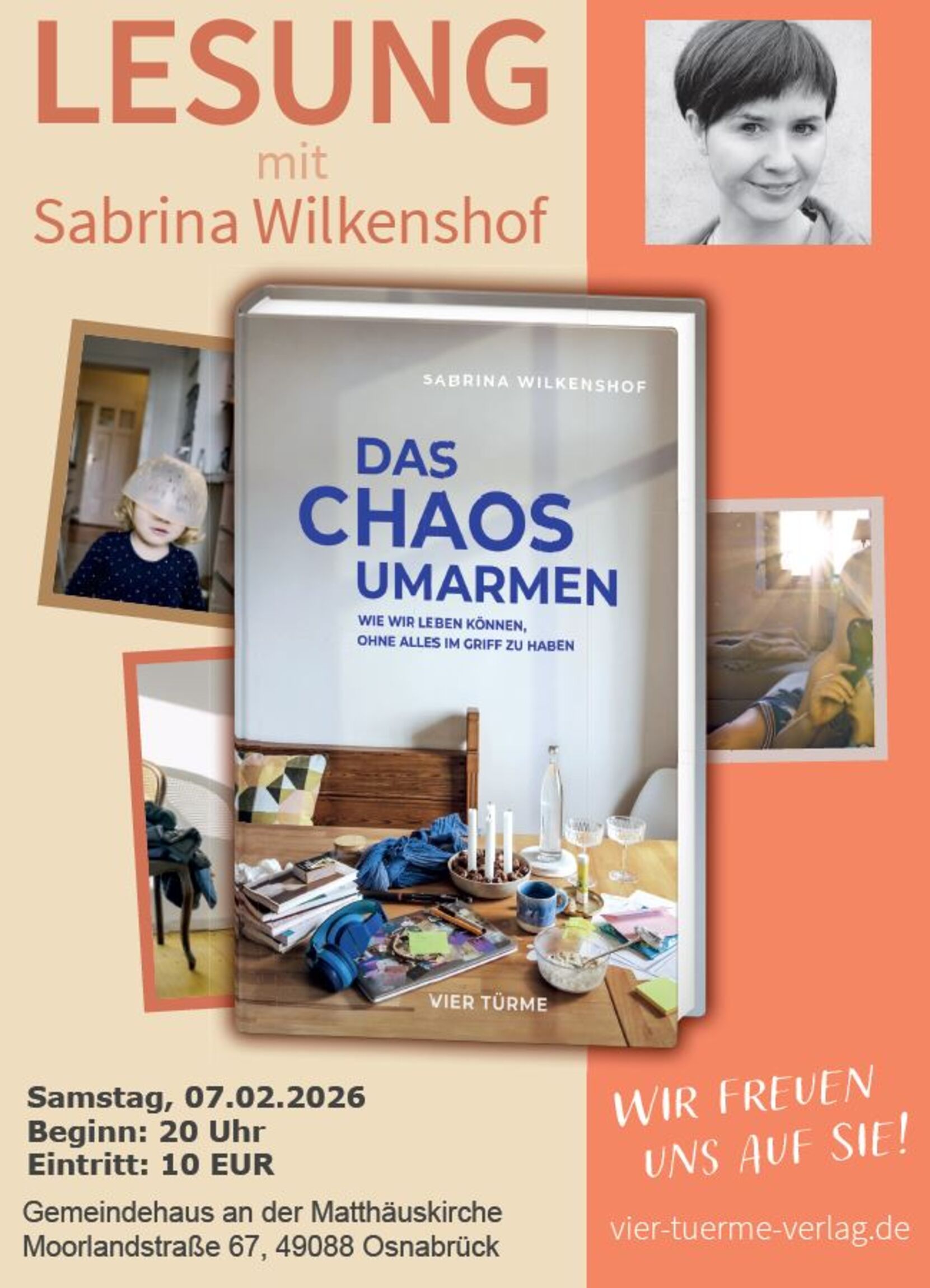 Am Samstag, 7. Februar, ist die Autorin und Theologin Sabrina Wilkenshof im Gemeindehaus an der Matthäuskirche, Moorlandstr. 67, 49088 Osnabrück, zu Gast. Um 20 Uhr liest sie aus ihrem neuen Buch „Das Chaos umarmen – Wie wir leben können, ohne alles im Griff zu haben“, das im Januar im Vier-Türme-Verlag erscheint. Der Eintritt beträgt 10 Euro.
