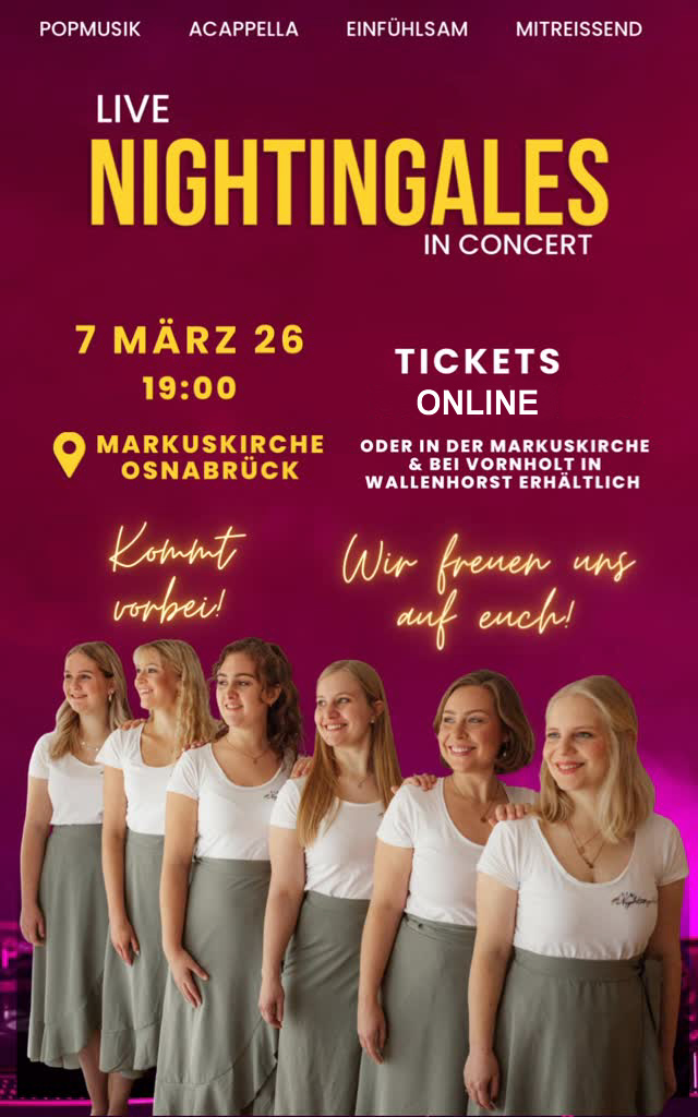 Am Samstag, 7. März, um 19 Uhr präsentieren die Nightingales ihr neues Konzert unter dem Titel „Nightingales in Concert“ in der Markuskirche Osnabrück, Julius-Heywinkel-Weg 2, 49076 Osnabrück. Die Besucherinnen und Besucher dürfen sich auf ein einfühlsames und zugleich mitreißendes Live-Erlebnis freuen, geeignet für Groß und Klein.