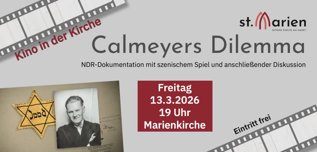 Am Freitag, 13. März, um 19 Uhr wird in der St.-Marien-Kirche, An der Marienkirche, 49074 Osnabrück, die NDR-Dokumentation „Calmeyers Dilemma“ gezeigt. Der Osnabrücker Jurist Hans Georg Calmeyer (1903–1972) war von 1941 bis 1945 von den Natioalsozialisten als „Rassereferent“ in den bestezten Niederlanden eingesetzt. Nach Vorgaben der NS-Rassenpolitik hatte er die Herkunft der Menschen dort zu klären: Arier oder Jude – was hieß: Leben oder Deportation, also meist Tod.