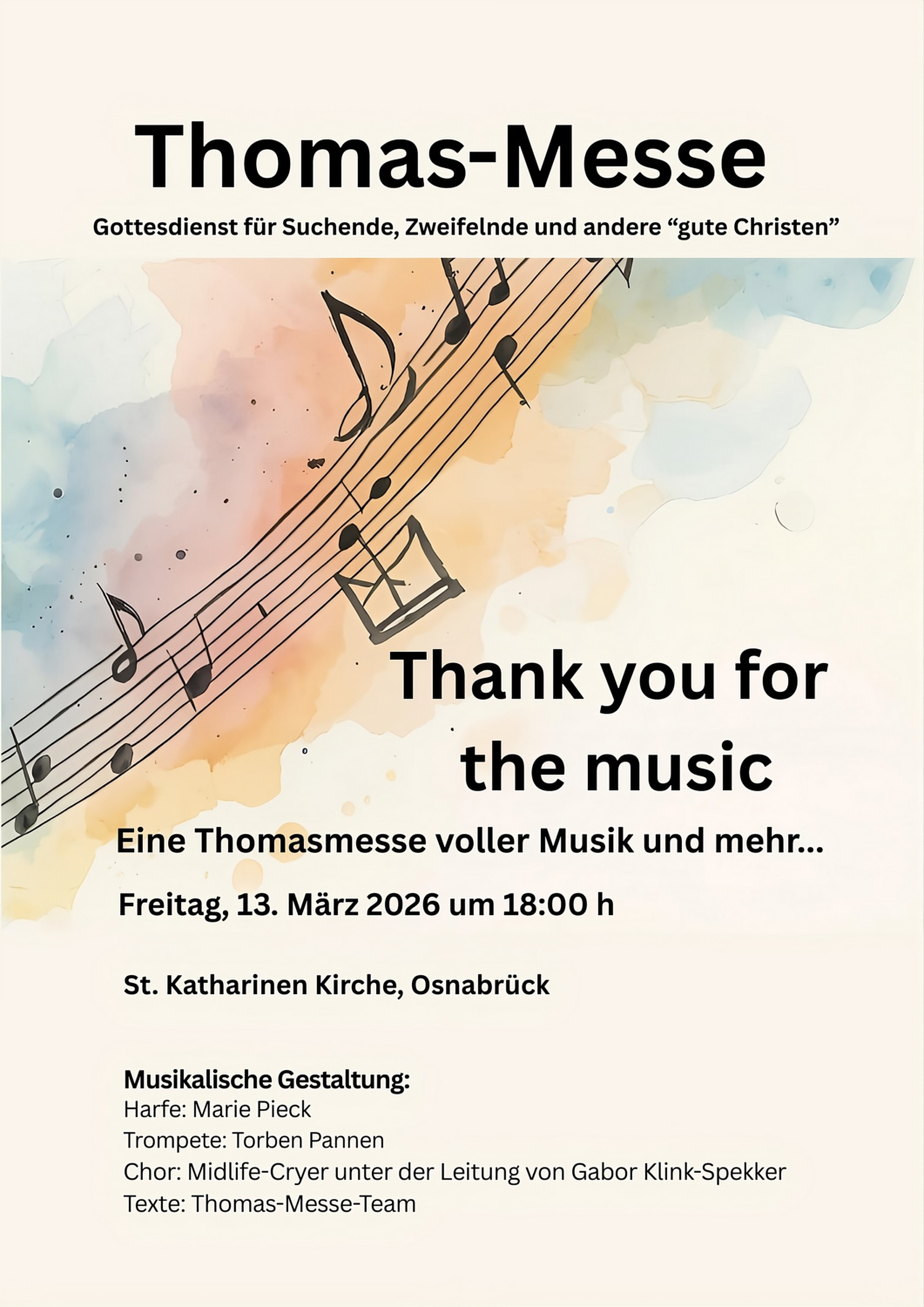 Unter der Überschrift „Thank you for the music“ findet am Freitag, 13. März, eine Thomas-Messe voller Musik und mehr in der St.-Katharinen-Kirche, An der Katharinenkirche 8, 49074 Osnabrück, statt. Der Gottesdienst für „Suchende, Zweifelnde und andere gute Christen“ beginnt um 18 Uhr.