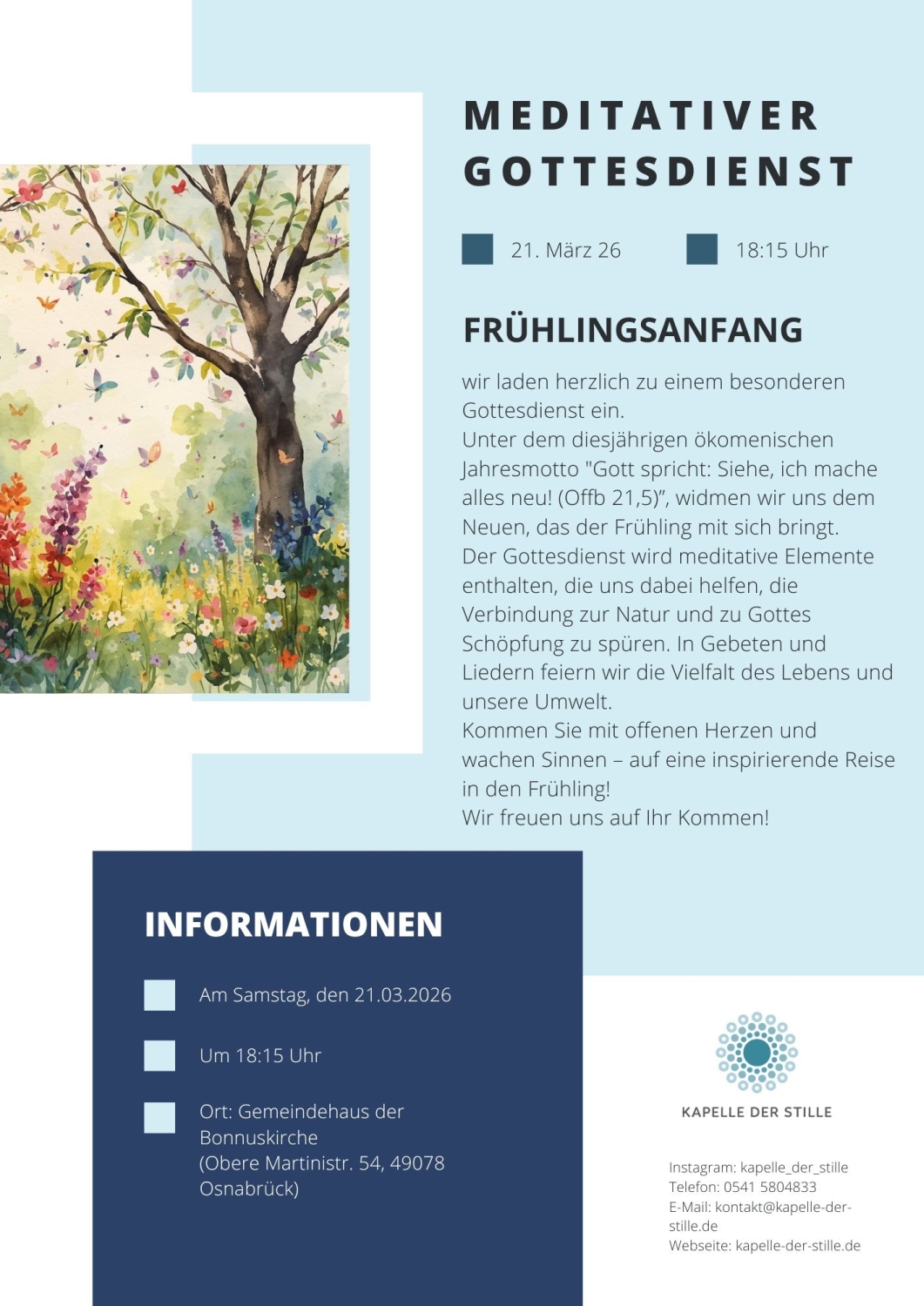 Die Kapelle der Stille lädt am Samstag, 21. März, um 18.15 Uhr, zu einem meditativen Gottesdienst zum Frühlingsanfang in das Gemeindehaus der Bonnuskirche, Obere Martinistraße 54, 49078 Osnabrück, ein.
