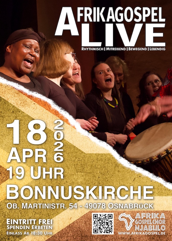 Der Afrika-Gospelchor Njabulo lädt am Samstag, 18. April, um 19 Uhr zu einem musikalischen Abend in die Evangelisch-lutherische Bonnuskirche, Obere Martinistraße 54, 49078 Osnabrück, ein. Der Chor unter der Leitung von Max-Ole Tammen kündigt ein Konzert mit afrikanischer Gospelmusik, kraftvollen Stimmen, lebendigen Rhythmen und spürbarer Freude am gemeinsamen Singen an. „Die Musik verbindet, bewegt und schafft eine besondere Atmosphäre, die Menschen über Generationen hinweg anspricht“, teilt der Chor mit. Einlass ist ab 18.30 Uhr.