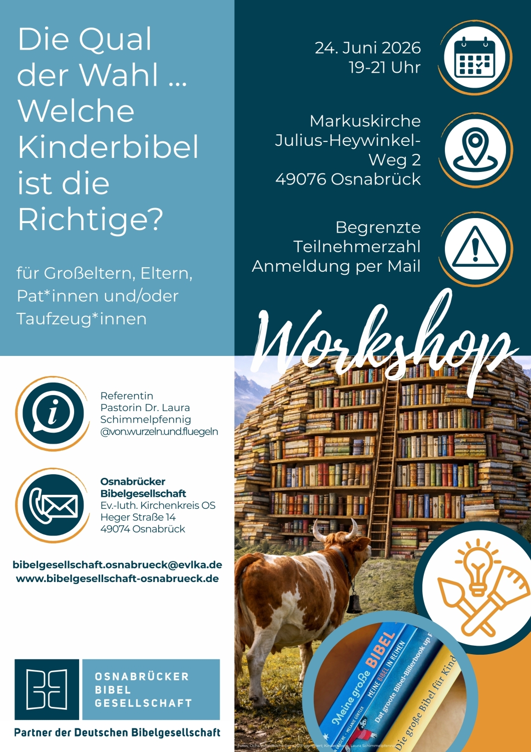 In diesem Workshop nehmen wir verschiedene Kinderbibeln gemeinsam in den Blick. Wir vergleichen Inhalte, Sprache, Bilder und Altersangemessenheit und sprechen darüber, welche Ausgaben sich für unterschiedliche Kinder und Anlässe besonders eignen. So erhalten Großeltern, Eltern, Pat*innen und Taufzeug*innen eine hilfreiche Orientierung für ihre Entscheidung.